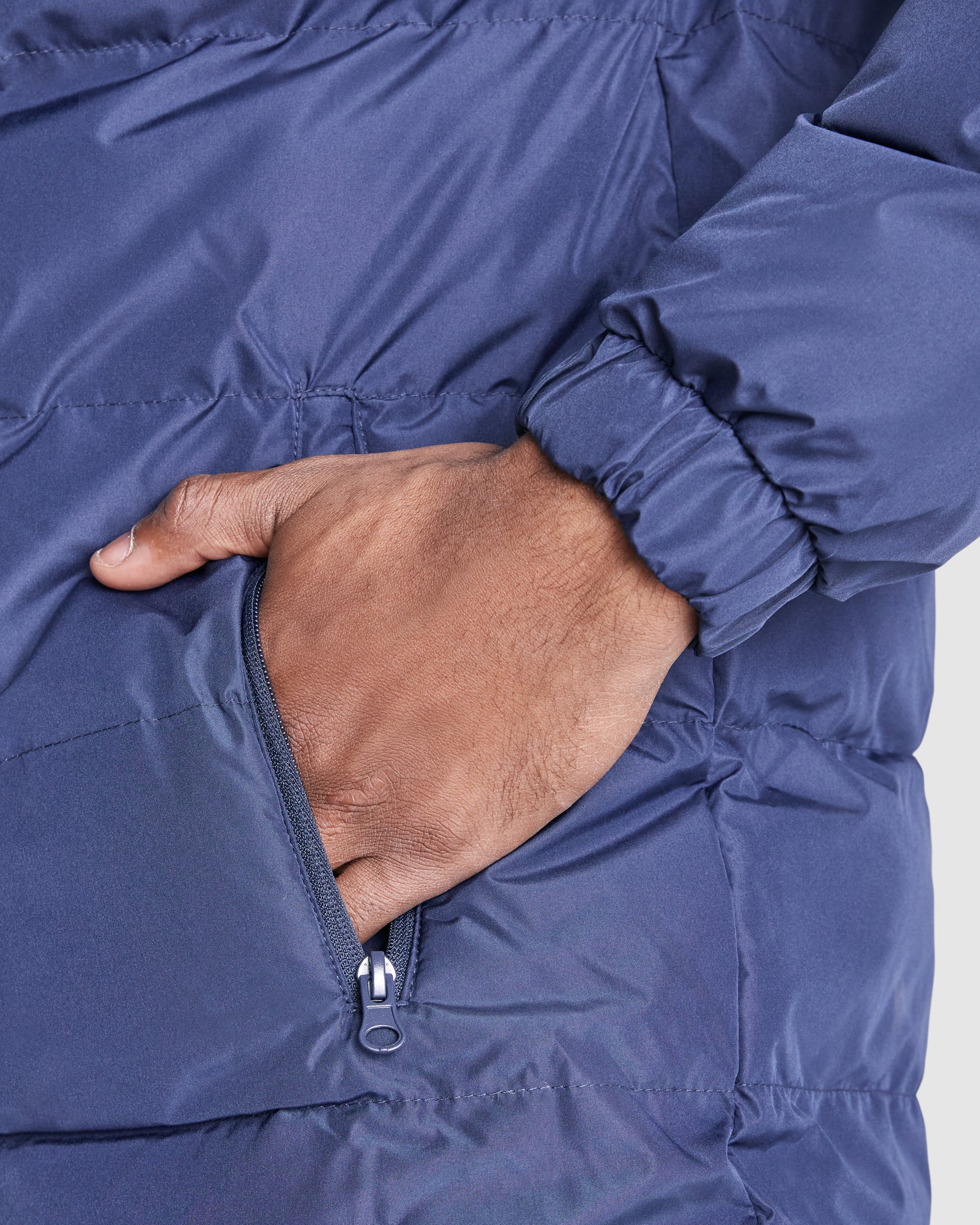 Parka acolchada repelente al agua con capucha fija y visera. Cremallera frontal al tono y tirador de doble dirección. Protector de barbilla del mismo tejido. Puños elásticos.